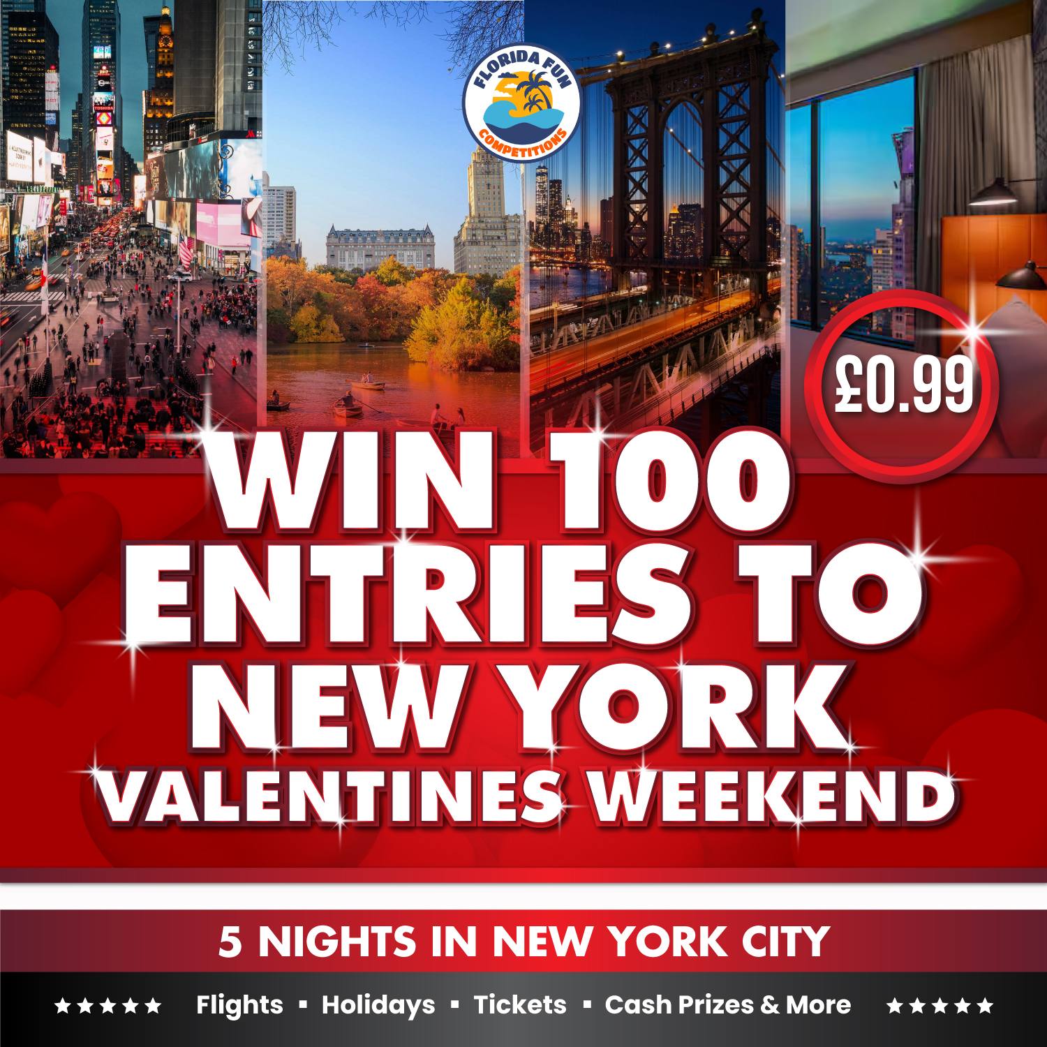 Ready for a romantic escape to the city that never sleeps? You could be on your way to New York with your special someone this Valentine’s Day—now with 100 extra chances to win! Enter now for just £0.99!