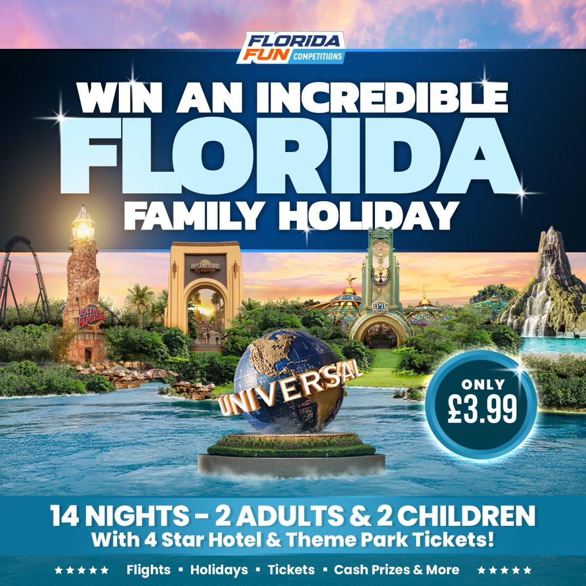 This competition is for UK residents aged 18 and above. Travel Insurance and ESTA is not included. This will be the prize winners responsibility. Holiday package dates can be modified, but changes to the airline, hotel, or other services are not permitted. Any date changes may incur additional costs for the prize winner. Entry limits may change during the competition. Maximum tickets per user is 150. Upon ordering, you’ll receive an email confirmation with randomly allocated ticket number(s). There are a total of 1,999 tickets available. If competition does not sell out, the draw will still occur on February 16th, 2025. To qualify for the live draw, you must correctly answer the competition question; incorrect entries won’t be considered. You can enter online or for free via postal entry sent to Florida Fun Competitions, but you need an account on Florida Fun Competitions for processing. Make sure your entry details match your account for confirmation and ticket allocation. Additional charges may apply for any alterations made to the booking. Postal entries without a registered account won’t be processed. View full postal entry guidelines here. The live draw, on Florida Fun Competitions Facebook page, will use Google’s random number generator to select the winning ticket. This competition is not affiliated with Facebook, Apple, or Google. By entering, you agree that these platforms aren’t liable or responsible for the competition’s administration or promotion